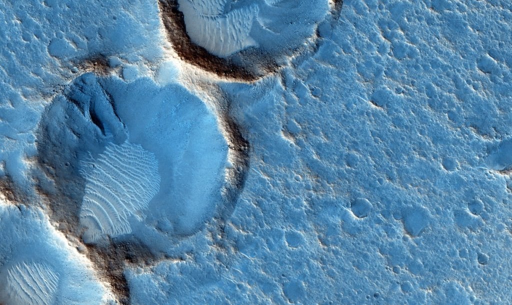 Mars Keşif Yörünge Aracı'nın HiRISE kamerasından alınan bu yakın çekim, Güney Acidalia Planitia'daki aşınmış kraterleri ve rüzgarla savrulan tortuları gösteriyor. Standart HiRISE görüntü renklerinde çarpıcı bir mavi tonu, insan gözüne muhtemelen gri veya biraz kırmızımsı görünecektir. Ancak Andy Weir'in bilim kurgu romanındaki "Marslı"daki NASA astronotlarının gözlerini saymazsanız, insan gözleri bu araziye bakmamıştır. Roman, bu kırpılmış HiRISE karesinin koordinatlarına karşılık gelen kurgusal Mars görevi Ares 3 iniş sahasında mahsur kalan bir astronot olan Mark Watney'nin maceralarını anlatıyor. Ölçek açısından, Watney'nin sahadaki 6 metre çapındaki yaşam alanı, büyük kraterin çapının yaklaşık 1/10'u olacaktır. Elbette, Ares 3 iniş koordinatları, 1997 Pathfinder iniş alanı olan (gerçek hayattaki) Carl Sagan Anıt İstasyonu'nun yalnızca yaklaşık 800 kilometre kuzeyindedir.