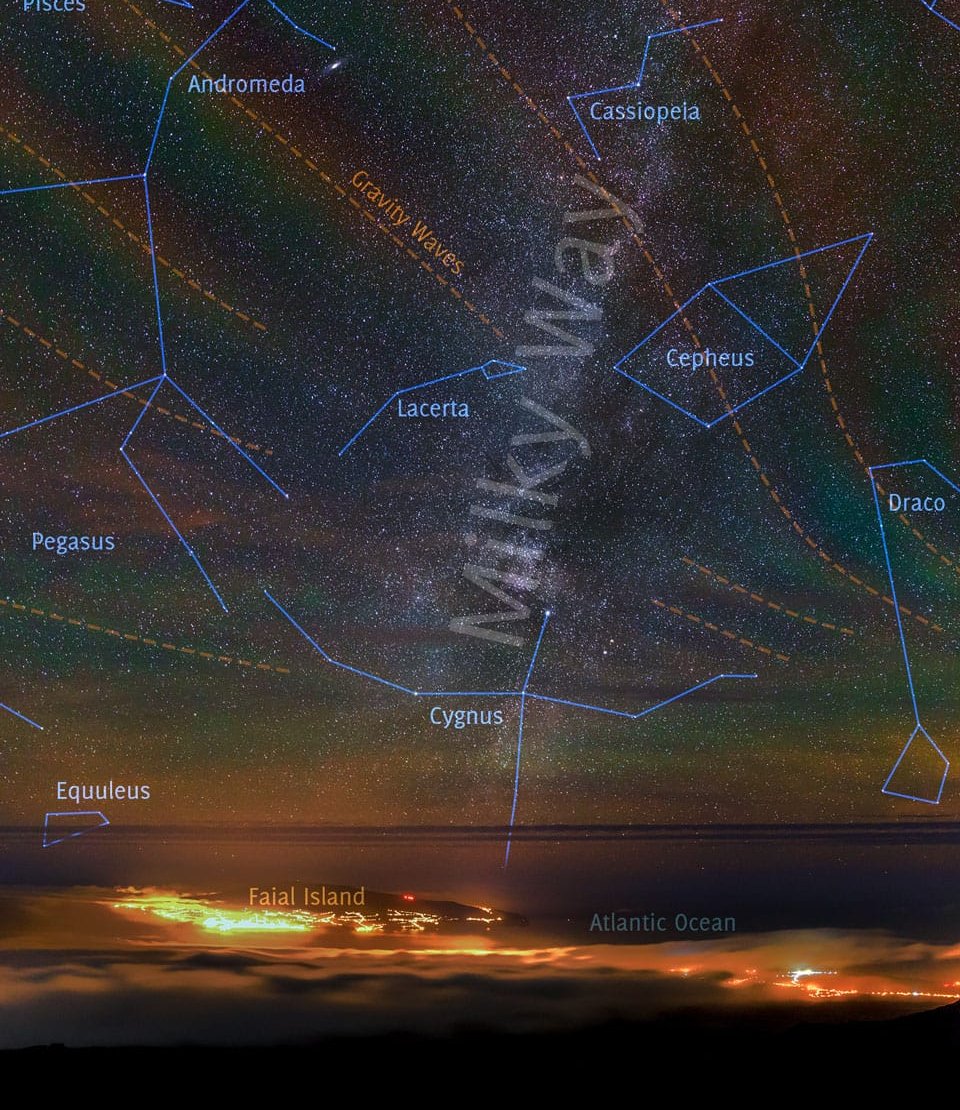 Gökyüzü neden dev bir tekrarlayan gökkuşağı gibi parlıyor? Hava parıltısı. Şimdi, hava her zaman parlar, ancak bunu görmek genellikle zordur. Ancak yaklaşan bir fırtına gibi bir rahatsızlık, Dünya atmosferinde fark edilir dalgalanmalara neden olabilir. Bu yerçekimi dalgaları, sakin suya bir kaya atıldığında oluşanlara benzer havadaki salınımlardır. Hava parıltısının neredeyse dikey duvarları boyunca uzun süreli pozlama, dalgalı yapıyı muhtemelen özellikle görünür hale getirmiştir. Tamam, ama renkler nereden kaynaklanıyor? Koyu kırmızı parıltı, büyük olasılıkla Güneş'ten gelen ultraviyole ışıkla uyarılan yaklaşık 87 kilometre yükseklikteki OH moleküllerinden kaynaklanıyor. Turuncu ve yeşil hava parıltısı, büyük olasılıkla biraz daha yukarıda bulunan sodyum ve oksijen atomlarından kaynaklanıyor. Öne çıkan görüntü, Portekiz'in Azor Adaları'ndaki Pico Dağı'na tırmanış sırasında çekildi. Yer ışıkları, Atlas Okyanusu'ndaki Faial adasından kaynaklanıyor. Bu bantlı hava parıltısı arasından muhteşem bir gökyüzü görülebiliyor; Samanyolu Gökadamızın merkez bandı görüntünün ortasından yukarı doğru uzanıyor ve Andromeda Gökadası M31 sol üstte görülüyor.