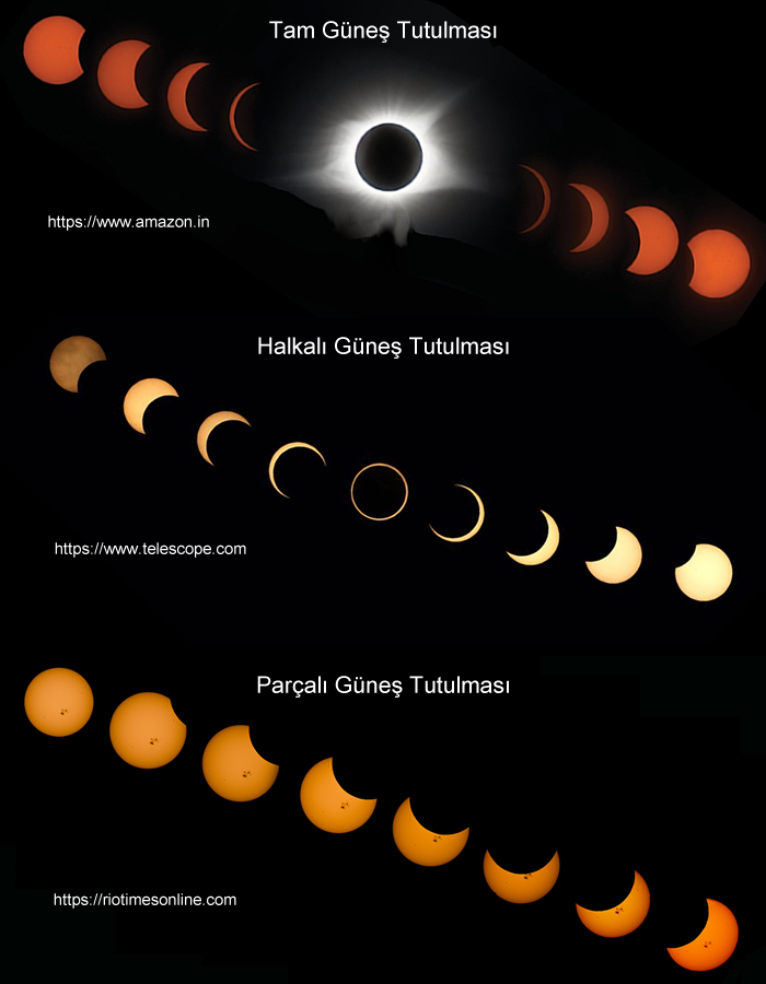 Şimdi ise Güneş tutulması çeşitlerinden bahsedelim. Tam Güneş tutulması, parçalı Güneş tutulması ve halkalı Güneş tutulması.