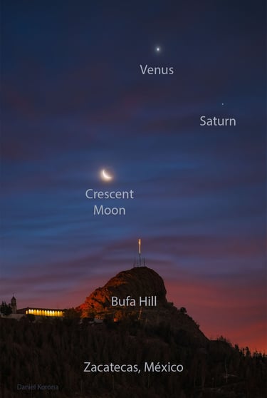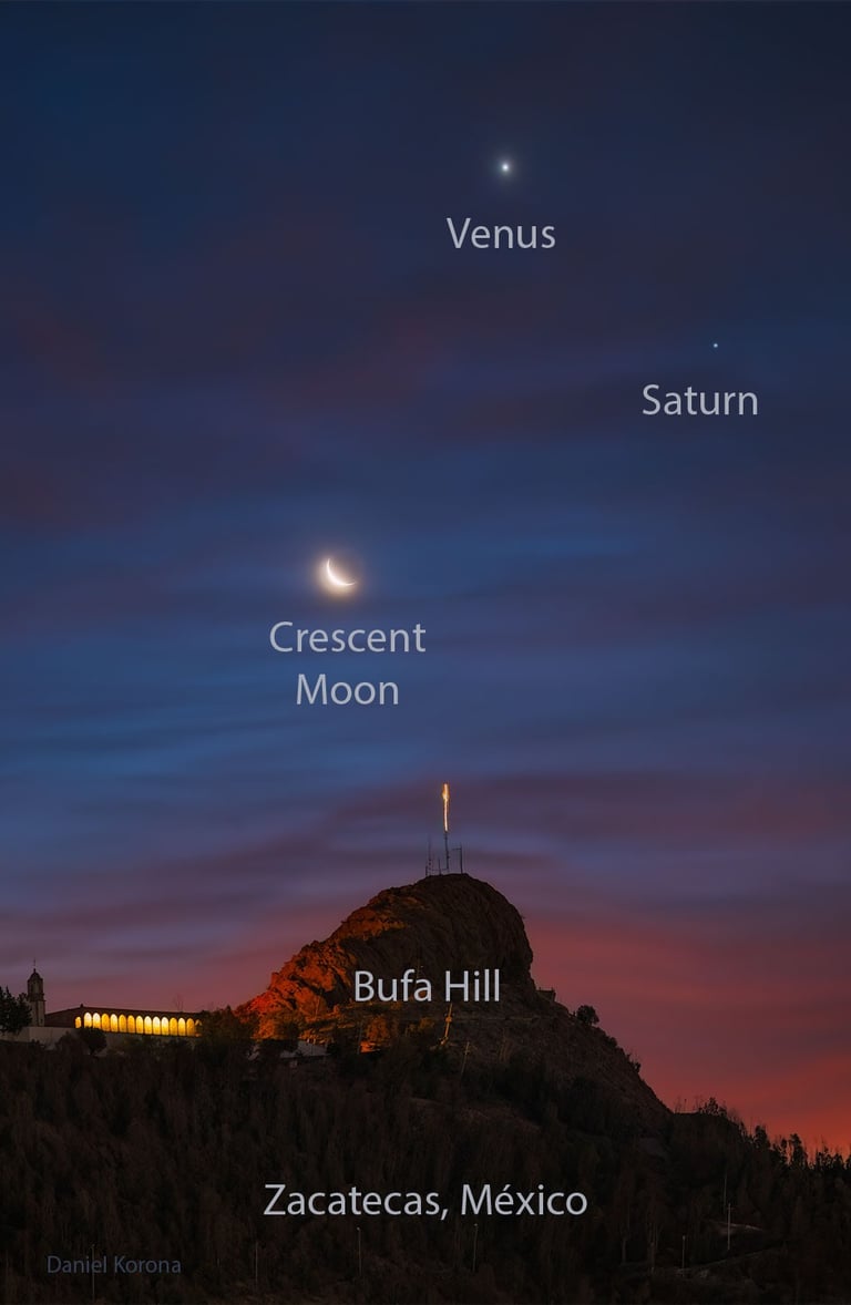 Bazen, gökyüzü kendisi gülümsemekte gibi görünür. Birkaç gün önce, dünyanın büyük bir kısmında görülebilen, Ay'ımızın Venüs ve Satürn gezegenleriyle alışılmadık bir üst üste gelmesi böyle ikonik bir yüz ifadesi yarattı. Özellikle, hilal şeklindeki Ay, görünüşte yakın gezegenlerle eşleştirildiğinde gece gökyüzünde mutlu bir yüz ifadesi oluşturuyordu. Resimde, Meksika'nın Zacatecas bölgesinde, ön planda belirgin Bufa Tepesi ile birlikte görülen manzara yer alıyor. En sağda ve en uzakta, Satürn gezegeni bulunuyor. Satürn'ün üst sol tarafında, gökyüzündeki en parlak gezegen olan Venüs, oldukça daha yakın bir konumda. Merkez ufkunun hemen üzerinde, Ay'ın azalan hilal evresinde olduğu görülüyor. Bu devasa simgeyi oluşturmak için, hilal ay fazının doğru yöne gülümsemesi gerekiyor.