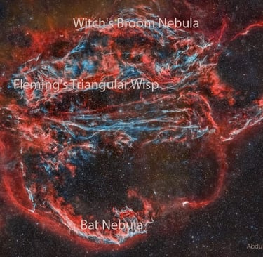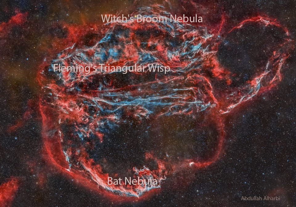 Samanyolu yıldızından geriye kalan tek görünür şey buna benzer bulutsu parçacıklarıdır. Yaklaşık 7.000 yıl önce bu yıldız bir süpernovada patladı ve ardında Peçe Bulutsusu bıraktı. O zamanlar, genişleyen bulut muhtemelen hilal Ay kadar parlaktı ve kayıtlı tarihin şafağında yaşayan insanlar için haftalarca görülebilirdi. Bugün, Cygnus Döngüsü olarak da bilinen, ortaya çıkan süpernova kalıntısı soluklaştı ve artık yalnızca Kuğu (Cygnus) takımyıldızına doğru yönlendirilmiş küçük bir teleskopla görülebiliyor. Ancak, kalan Peçe Bulutsusu fiziksel olarak çok büyük ve yaklaşık 1.400 ışık yılı uzaklıkta yer almasına rağmen, dolunaydan beş kat daha büyük bir alanı kaplıyor. Öne çıkan resim 2024 yılının ortalarında Kuveyt'te çekildi ve hidrojenin kırmızı, oksijenin ise mavi yaydığı ışığı gösteriyor. Peçe Bulutsusu'nun tamamının bunun gibi derin görüntülerinde, titiz okuyucular bile ikonik filamentleri belirleyemeyebilir.