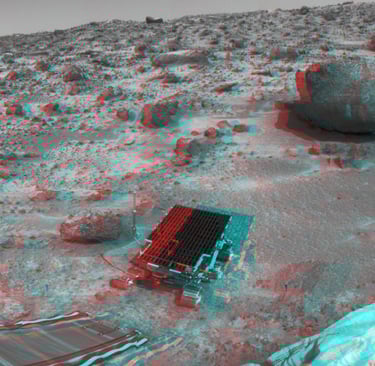Bu Temmuz 1997 tarihli resim, Pathfinder iniş aracından bir rampayı, Sojourner robotunu, inmiş hava yastıklarını, bir kanepeyi, Barnacle Bill ve Yogi Rock'ı Mars yüzeyinin bu 3D stereo görünümünde bir arada gösteriyor. Barnacle Bill, ev kedisi boyutundaki, güneş panelleriyle kaplı Sojourner'ın hemen solundaki kayadır. Yogi, sağ üstteki büyük, dostça görünen kayadır. "Kanepe", ufukta merkez yakınında görülen açılı kaya şeklidir. Dramatik 3D perspektifi elde etmek için resmi kırmızı/mavi gözlükle (ya da sol gözünüze şeffaf kırmızı bir plastik parçası, sağ gözünüze mavi veya yeşil bir parça tutarak) inceleyin. Stereo görünüm, olağanüstü Mars Pathfinder Görüntüleyici (IMP) kamerası tarafından kaydedilmiştir. IMP, stereo görüntüleme ve mesafe ölçümü için iki optik yola sahipti ve spektral analiz için bir dizi renk filtresi ile donatılmıştı. Mars'taki ilk astronomik gözlemevi olarak çalışan IMP, ayrıca Güneş ve Mars'ın iki küçük uydusundan en küçüğü olan Deimos'un görüntülerini de kaydetmiştir.